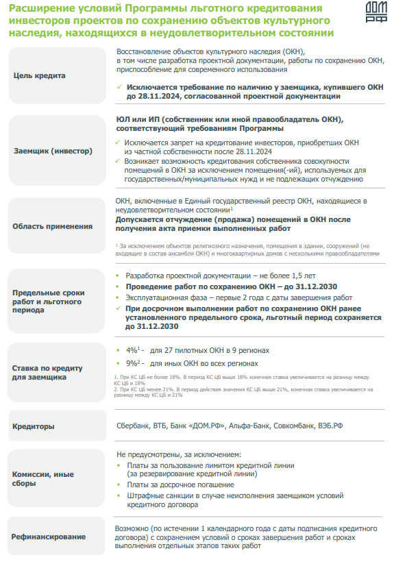 Расширение условий Программы льготного кредитования инвесторов проектов по сохранению объектов культурного наследия, находящихся в неудовлетворительном состоянии